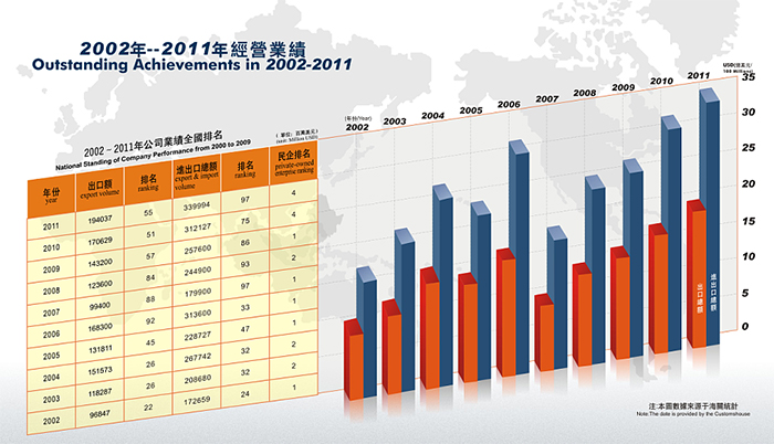 近年來,公司發(fā)展勢頭良好, 2014年公司實際出口額達到10.5億美金,排名“2014中國出口200強”第192名,其中民營企業(yè)排名第21名。公司先后獲得 “中國守合同重信用企業(yè)”、 “廣東省先進集體”、“廣東省優(yōu)秀民營企業(yè)”、“東莞市50強民營企業(yè)”,“東莞市文明單位”等稱號,公司被東莞市政府授予“東莞市50強民營服務(wù)業(yè)企業(yè)”光榮稱號,公司董事長陳海生被授予“東莞市優(yōu)秀民營企業(yè)家”光榮稱號。